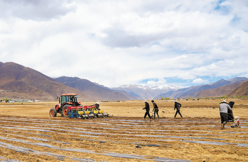 立夏时节,西藏迎来春耕高峰,各地群众抢抓农时,加快播种进度,为丰收打好基础。图为墨竹工卡县唐加乡拉东村村民使用播种机在进行玉米播种作业。洛克 记者 唐斌 摄