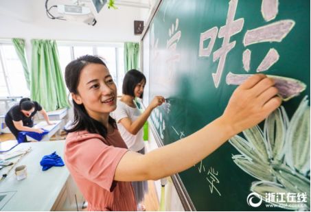 8月26日,在德清县武康街道东风小学101班教室内,任课老师们打扫卫生、布置环境,精心做好各项准备工作,迎接一年级新生到来。(浙江在线拍友王正 程昊 摄)