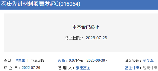 公告称,泰康先进材料股票型发起式证券投资基金(以下简称“本基金”)于2025年7月26日日终触发了《基金合同》规定的终止情形,泰康基金管理有限公司(以下简称“本基金管理人”)将自2025年7月28日起根据法律法规、基金合同等规定履行基金财产清算程序。