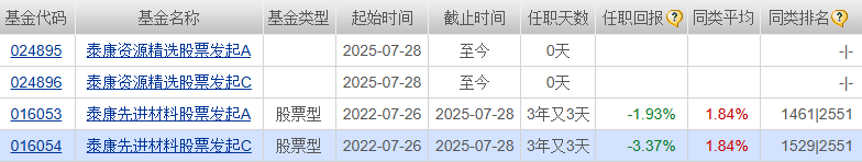 根据天天基金网数据显示,泰康先进材料股票发起A/C成立于2022年7月26日,截至最后运作日2025年7月25日,其累计单位净值为0.9807元、0.9663元,累计收益率为-1.93%和-3.37%。
