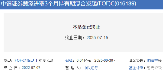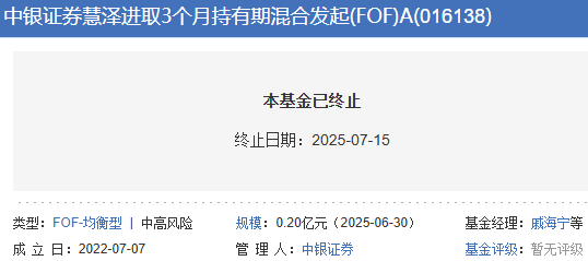近日,中银国际证券股份有限公司发布关于中银证券慧泽进取3个月持有期混合型发起式基金中基金(FOF)基金合同终止及基金财产清算的公告。