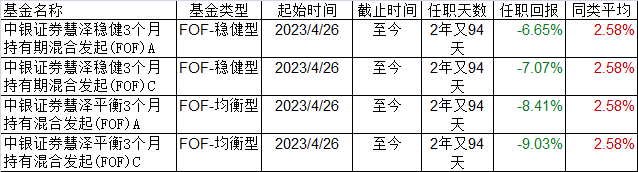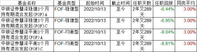 值得注意的是,除了目前已经清盘的中银证券慧泽进取3个月持有期混合发起。上述两位基金经理还共同管理着中银证券慧泽稳健3个月持有期混合发起(FOF)与中银证券慧泽平衡3个月持有混合发起(FOF)两只基金,但从2年多来的任职回报看,都跑输同类均值水平。