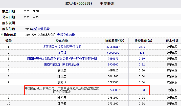 根据瑞贝卡2025年一季报显示,在其前十大流通股东中,仅有广发基金旗下的广发中证养老产业指数型发起式这一只基金位列其中。