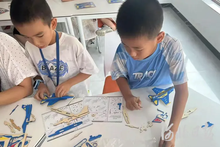 动手实践环节点燃了孩子们的热情。在志愿者的指导下,大家用环保材料组装航模,从剪裁机身到粘贴机翼,从调试平衡到绘制迷彩,每一个步骤都倾注着专注与思考。有的为模型装上五角星尾翼,有的在机身上写下“保卫祖国”,小小的航模承载着孩子们朴素的爱国情怀。