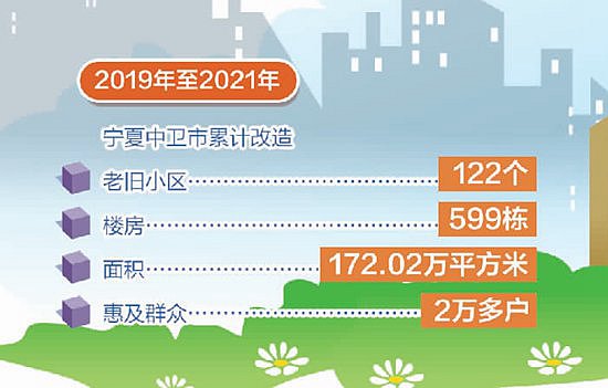 2019年以来,中卫市抢抓政策机遇,推进老旧小区改造,截至2021年,3年累计改造122个老旧小区599栋楼172.02万平方米,惠及群众2万多户。因为高质量实施改造,老旧小区焕然一新,新区和旧城风貌融为一体,城市“痛点”变成亮点,居民幸福指数大幅提升,广大群众赞不绝口,成为宁夏老旧小区改造的精品工程。