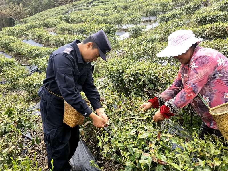 林芝边境管理支队派边境派出所移民管理警察帮助辖区群众采春茶。