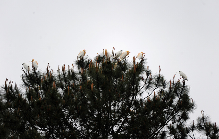 4月17日,鹭鸟在贵州省黔东南苗族侗族自治州丹寨县金泉街道乡间的树林上栖息。