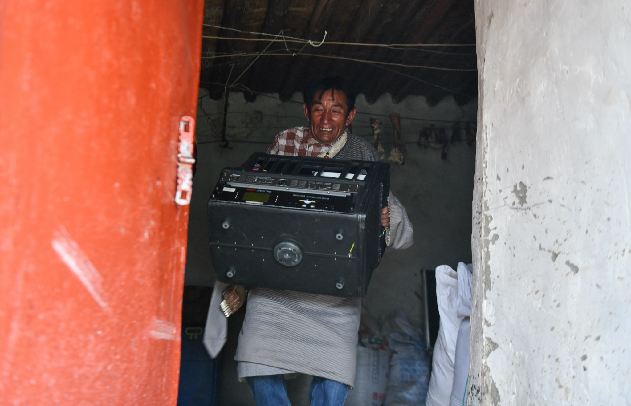 在西藏当雄县拉多村,罗珠在准备放映电影所需的器材(5月20日摄)。新华社记者 卞婷 摄