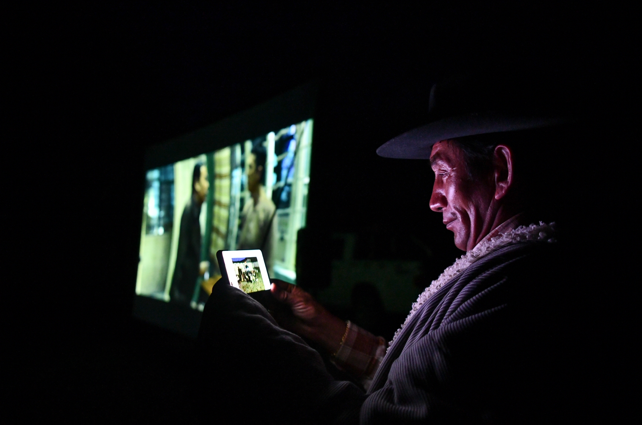 西藏当雄县巴灵村的村民在看电影(5月20日摄)。新华社记者 孙非 摄