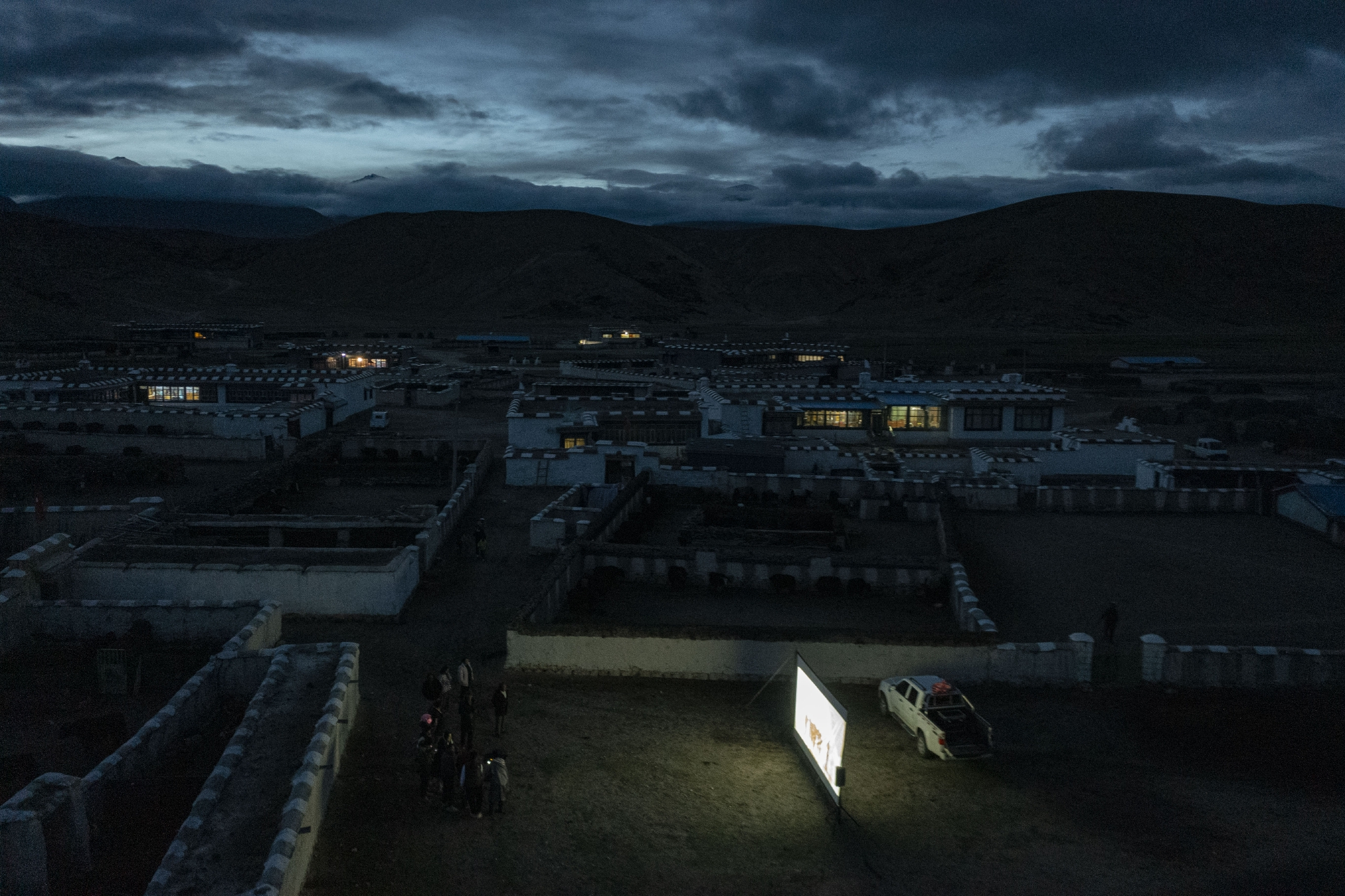 西藏当雄县巴灵村里在放映电影(5月20日摄,无人机照片)。新华社记者 孙非 摄