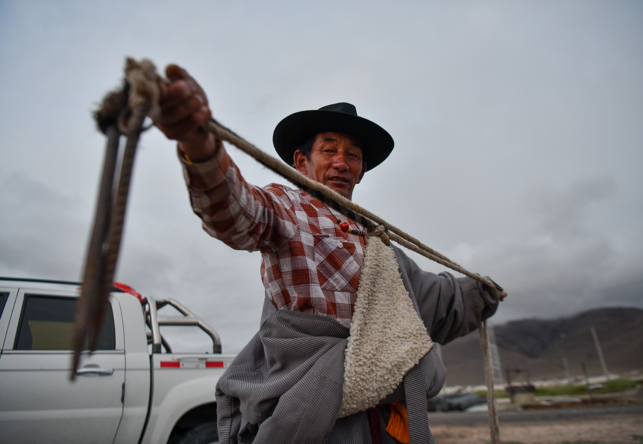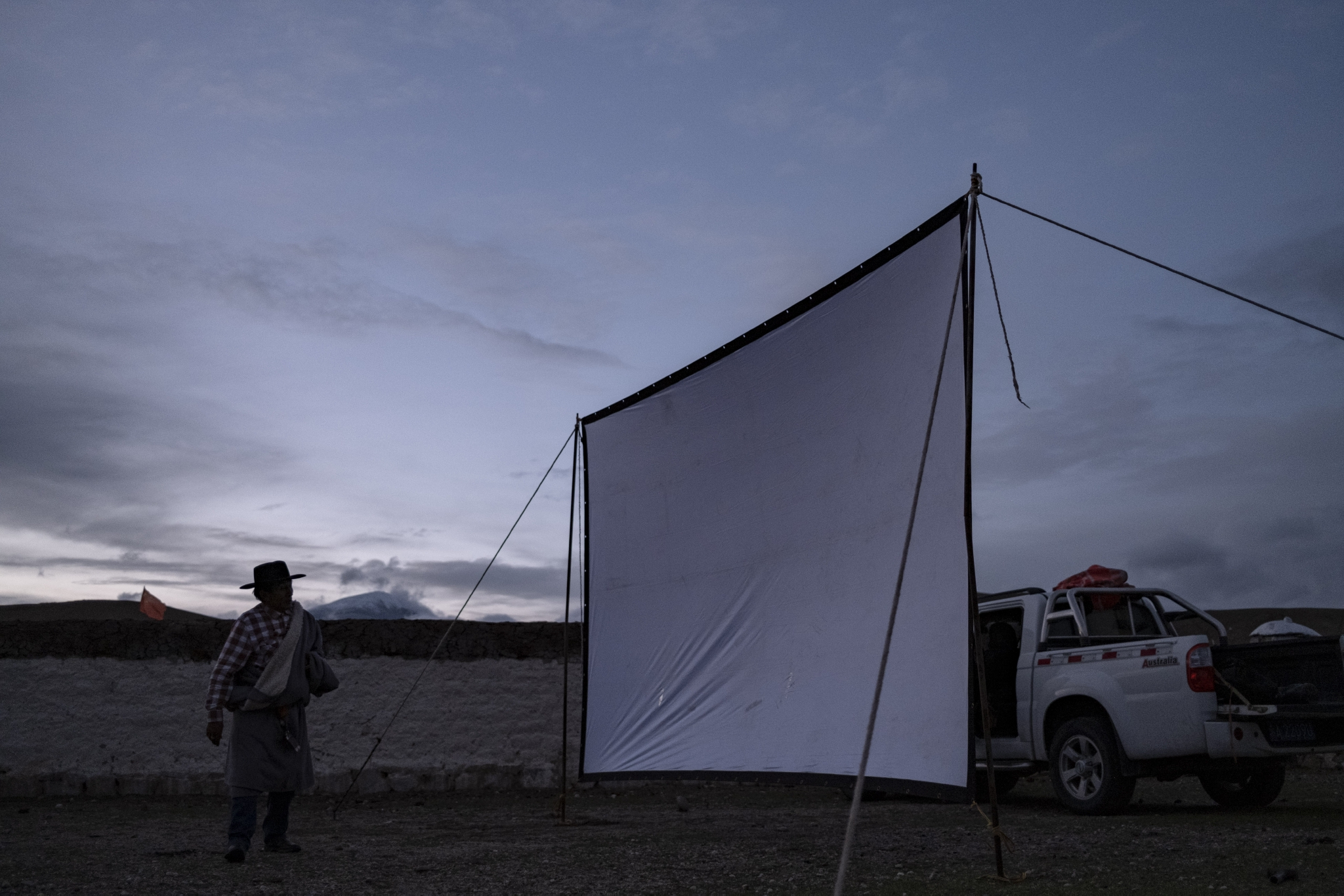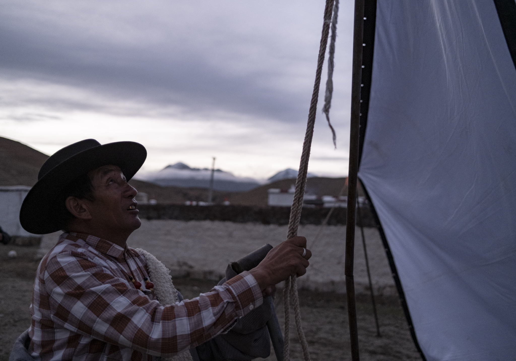 在西藏当雄县巴灵村,罗珠在检查搭建好的幕布(5月20日摄)。新华社记者 孙非 摄