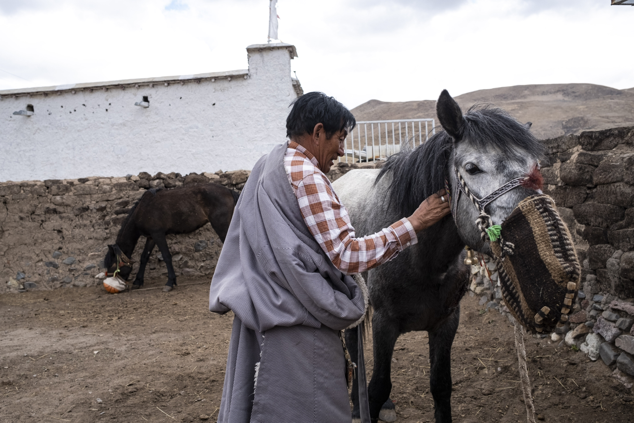 在西藏当雄县拉多村,罗珠在喂马(5月20日摄)。新华社记者 刘颍 摄