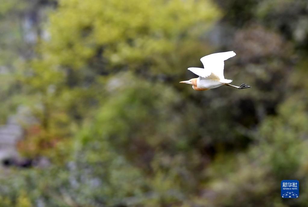 牛背鹭在玉麦乡境内原始森林边盘旋(5月31日摄)。新华社记者 张汝锋 摄
