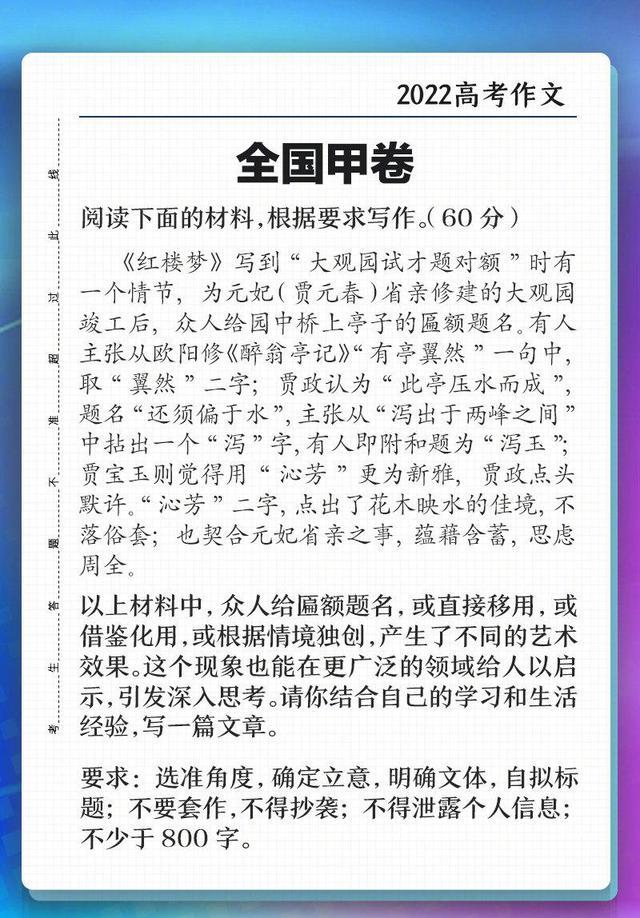 今天上午,备受关注的高考作文已经出炉,而2022全国甲卷高考语文作文题关注度尤其高的,甲卷作文为材料作文,要求根据《红楼梦》阅读材料进行写作。