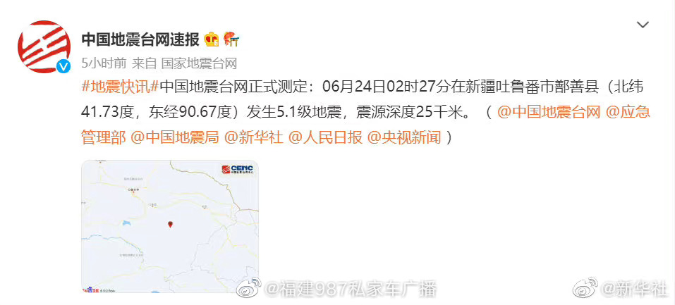 中国地震台网正式测定:06月24日02时27分在新疆吐鲁番市鄯善县(北纬41.73度,东经90.67度)发生5.1级地震,震源深度25千米。