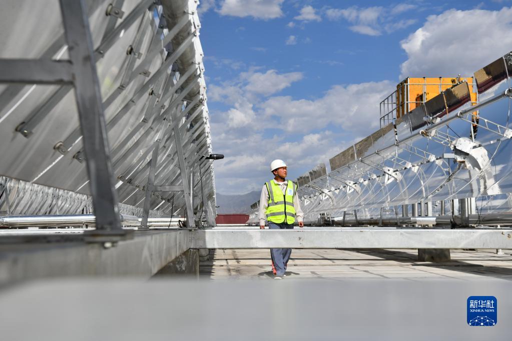 中建一局工作人员检查高散辐射主动式太阳能供暖设备(7月6日摄)。