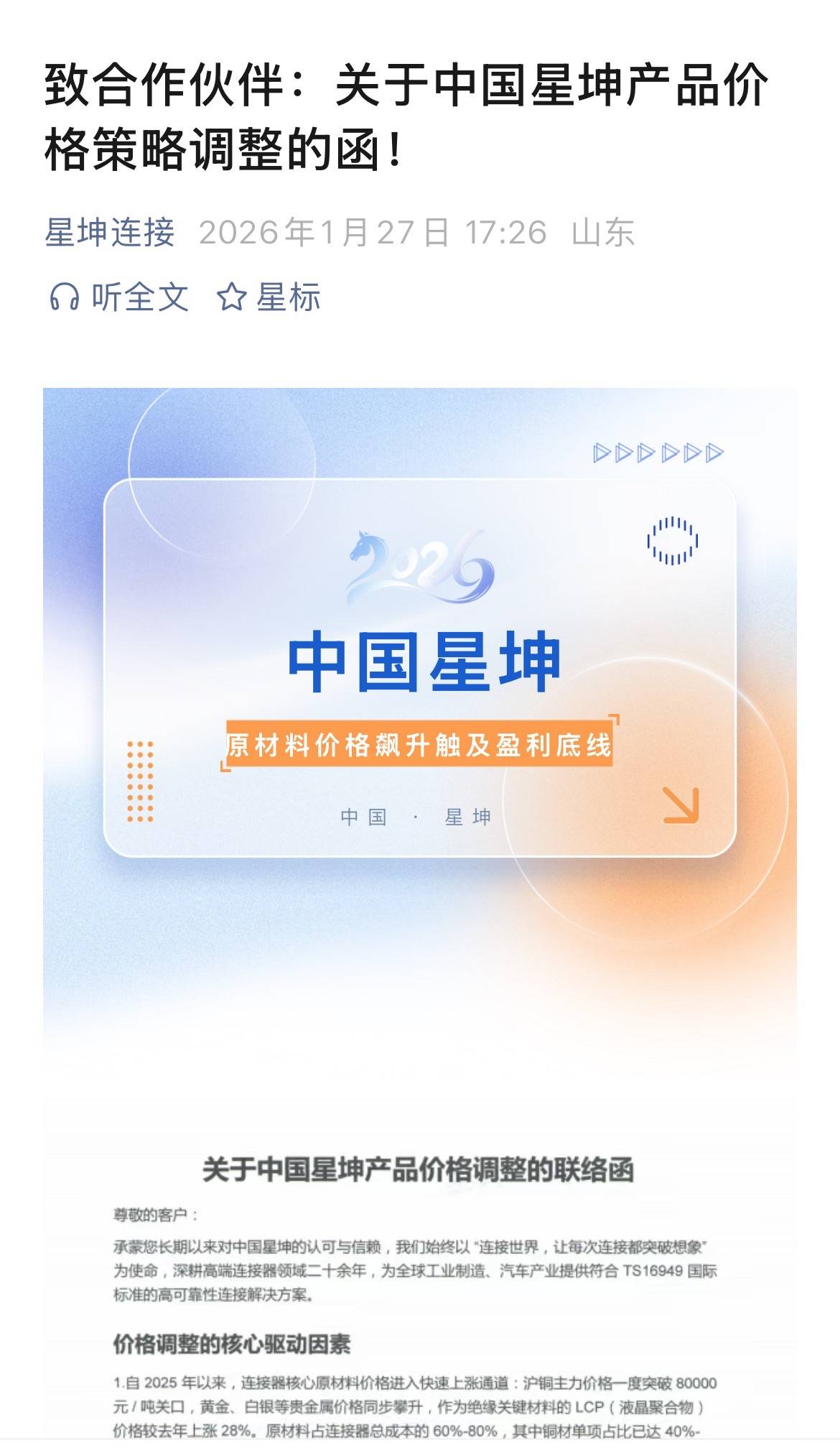 在全球连接器行业因原材料成本激增陷入涨价潮的背景下,连接器领先者广东星坤控股有限公司(XKB Connection)于2026年1月27日通过官方平台正式宣布产品价格调整方案。面对铜、黄金等核心原材料价格同比上涨超30%的严峻挑战,这家国产连接器领军企业明确表示“绝不以降低配置或技术标准缓解成本压力”,以“品质立本”的坚定姿态,为工业自动化、新能源汽车等关键产业的高质量发展筑牢根基。